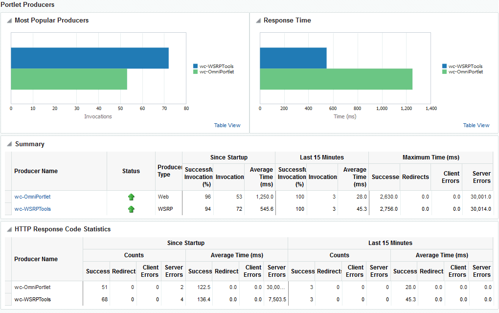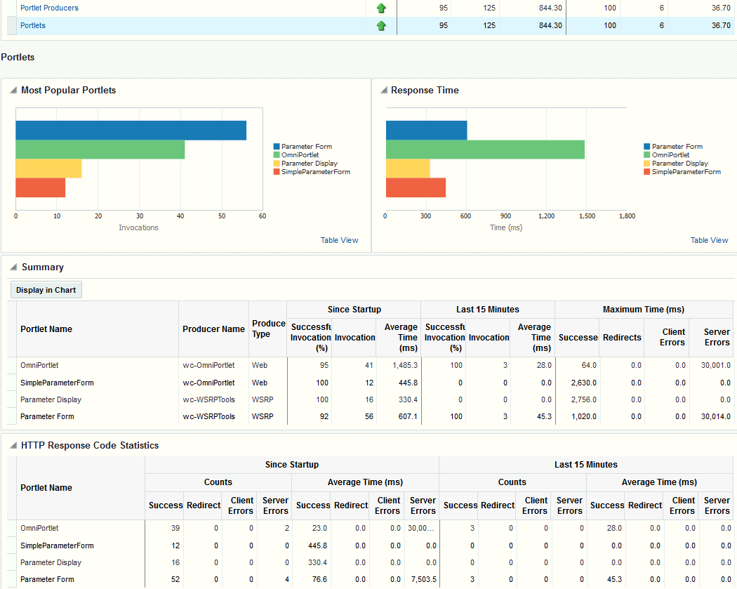 For example, consider WebCenter Portal deployed on a managed server that was started 4 hours ago. During that time, WebCenter Portal serviced 10,000 portlet requests with a total response time of 500, 000 ms. For this scenario, Since Startup metrics for portlets show:
