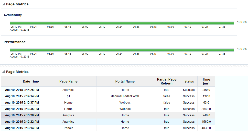 Since Startup and Recent History metrics calculate performance over a specific duration, and show aggregated metrics for that duration. In addition to these, Oracle WebCenter Portal collects and reports per-request performance information for a range of key WebCenter Portal metrics. Such metrics allow you to look at the success and response time of each request individually, without considering previous requests. Out-of-the-box, the last 100 samples are used to calculate key metric performance/availability but you can increase or decrease the sample set to suit your installation.