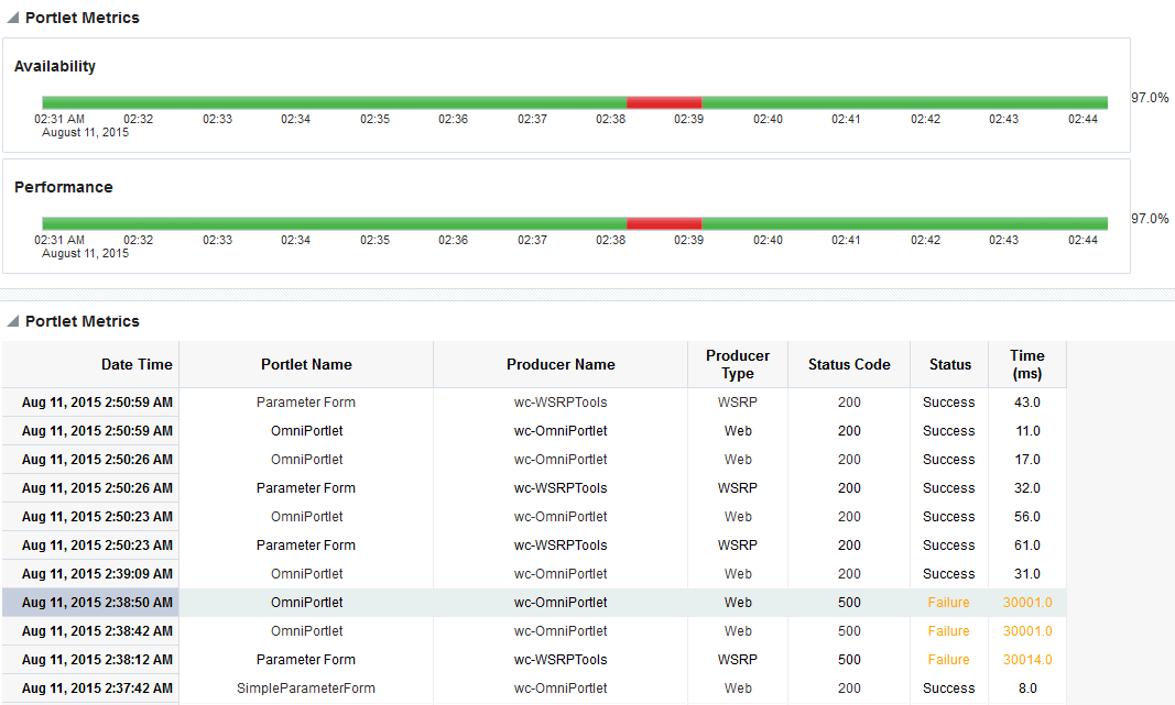Oracle WebCenter Portal captures end-user requests for pages and portlets, and a metric sample is collected for each request. For example, if user A accesses page X, both the availability of page X (success/fail metric) and theresponse timeof the request is captured by Oracle WebCenter Portal. Metric samples that take longer than a configured metric alert threshold or fail, show “red” in Fusion Middleware Control to immediately alert administrators when issues arise.