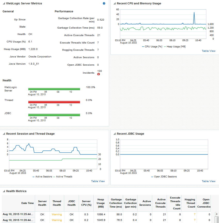 Next Step: If the charts indicate that CPU and memory usages are normal, verify the health of the WebLogic Server. |