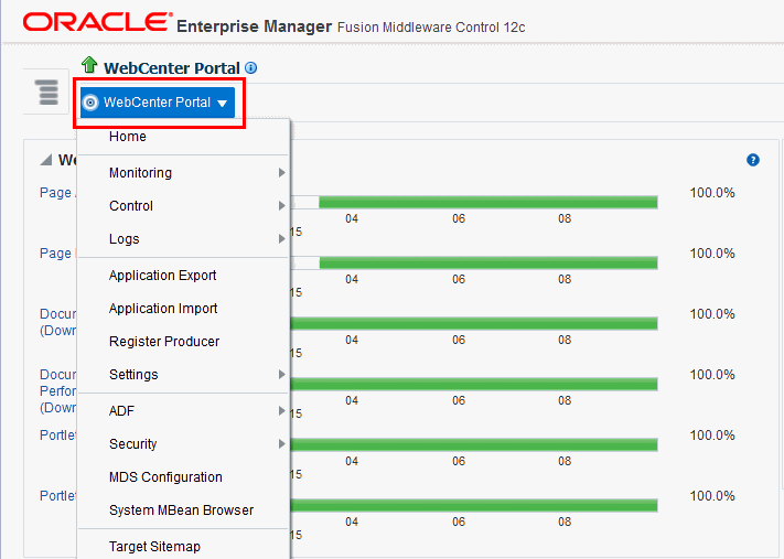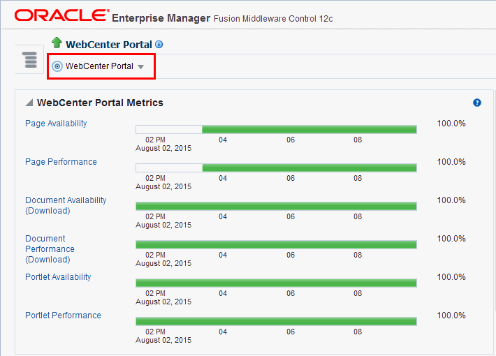 The WebCenter Portal home page is your starting place for managing WebCenter Portal. The page displays status, performance and availability of all the components and tools or services that make up WebCenter Portal.