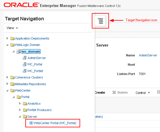 In the Target Navigation, expand WebCenter > Portal > Server.