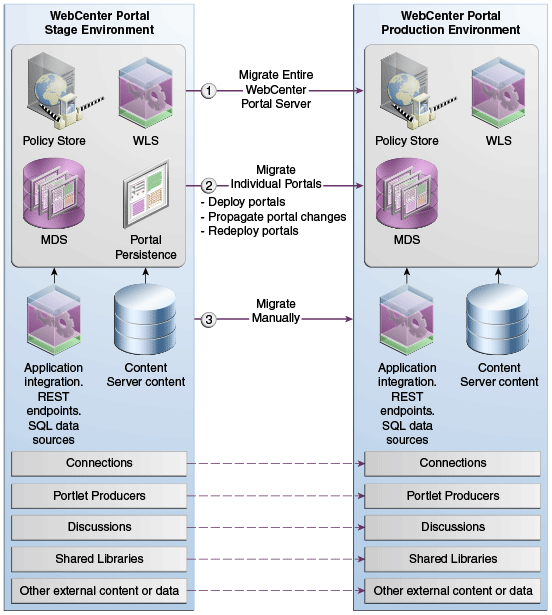 | Migrate the entire portal instance | Once both staging and production environments are set up and configured, copy your WebCenter Portal instance on stage to the target for the first time. |