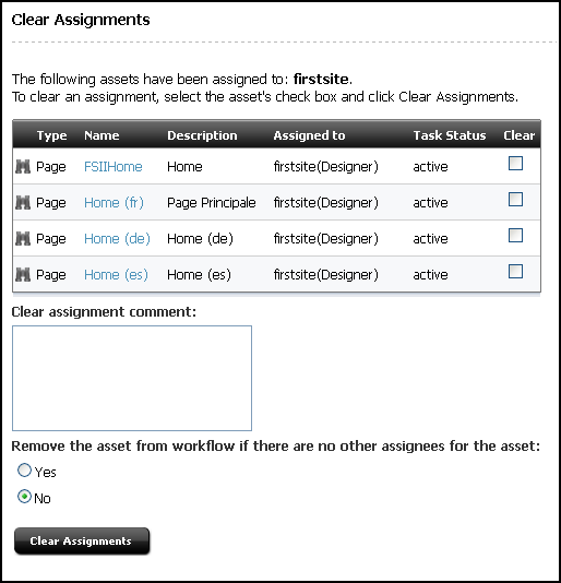An asset that a participant is working on is called an assignment. A user's assignment list is shown In the My Assignments form in the administrator's interface. Assets are assigned to users as soon as it enters a state the user to fulfills as workflow participant.