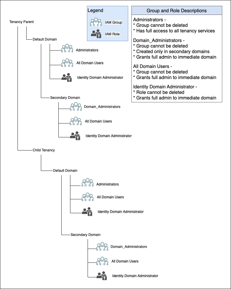 Cuando una instancia de Identity Cloud Service se convierte en IAM con dominios de identidad, los grupos del dominio por defecto son los siguientes (cuando se crean dominios secundarios, los grupos son los que se muestran en la sección anterior):
