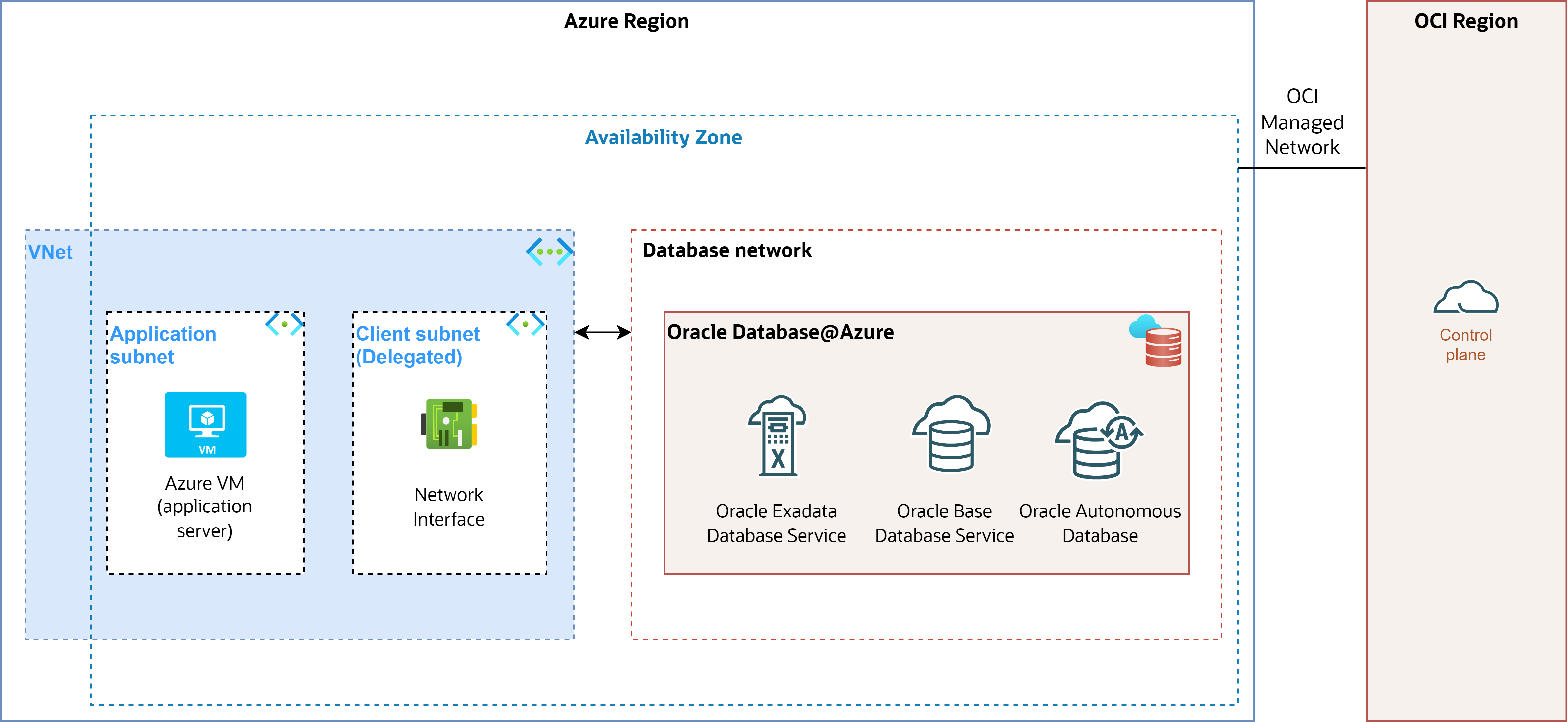 El siguiente diagrama de arquitectura de alto nivel muestra cómo una región de OCI (sitio principal) está conectada a la zona de disponibilidad (sitio secundario) de una región de Azure a través de una red gestionada de OCI como parte de Oracle AI Database@Azure. Un servidor de aplicaciones desplegado en la máquina virtual de Azure se conecta a las bases de datos Oracle desplegadas en una red de base de datos a través de una subred delegada. El plano de control, que es de alta disponibilidad y tolerante a fallos, se despliega en la región de OCI y ofrece una experiencia de administración y gestión de bases de datos perfecta.