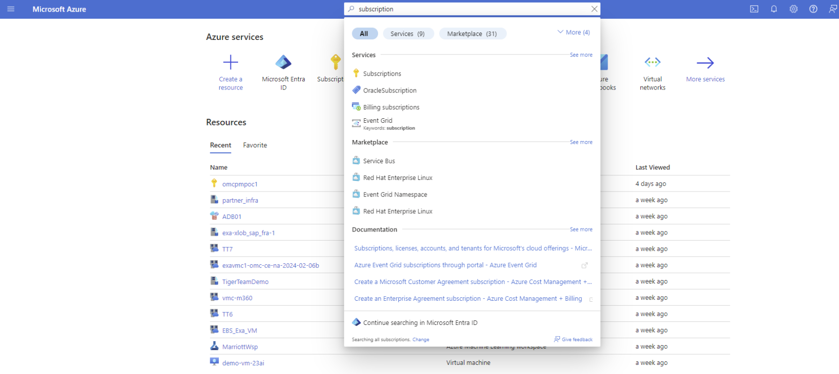 - Seleccione Suscripciones en los resultados de búsqueda para navegar a la vista de lista Suscripciones. Busque la suscripción que desea utilizar para la vinculación en la vista de lista.