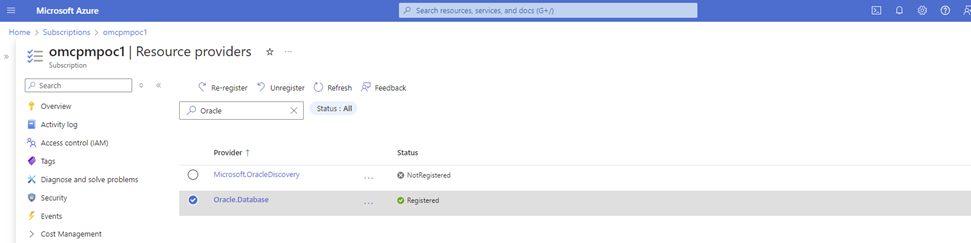 - Seleccione el recurso "Oracle.Database" en la lista Proveedor y, a continuación, seleccione Registrar. Espere a que el recurso muestre el estado "registered". Esta operación puede tardar unos minutos.