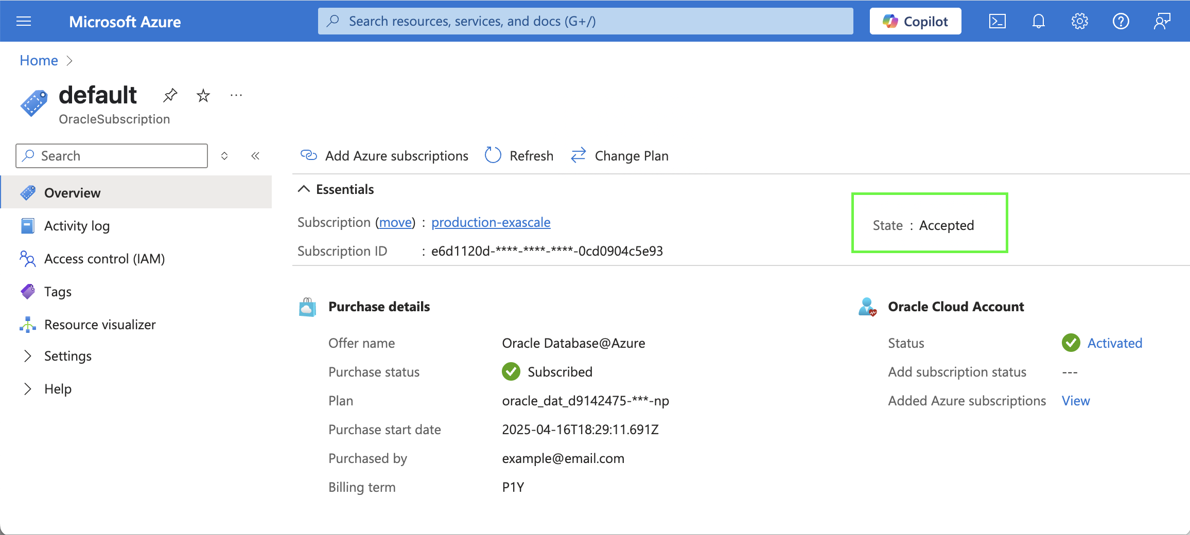 Seleccione default para ver la página de detalles de la oferta de Oracle AI Database@Azure a la que se ha suscrito durante la vinculación del servicio.
