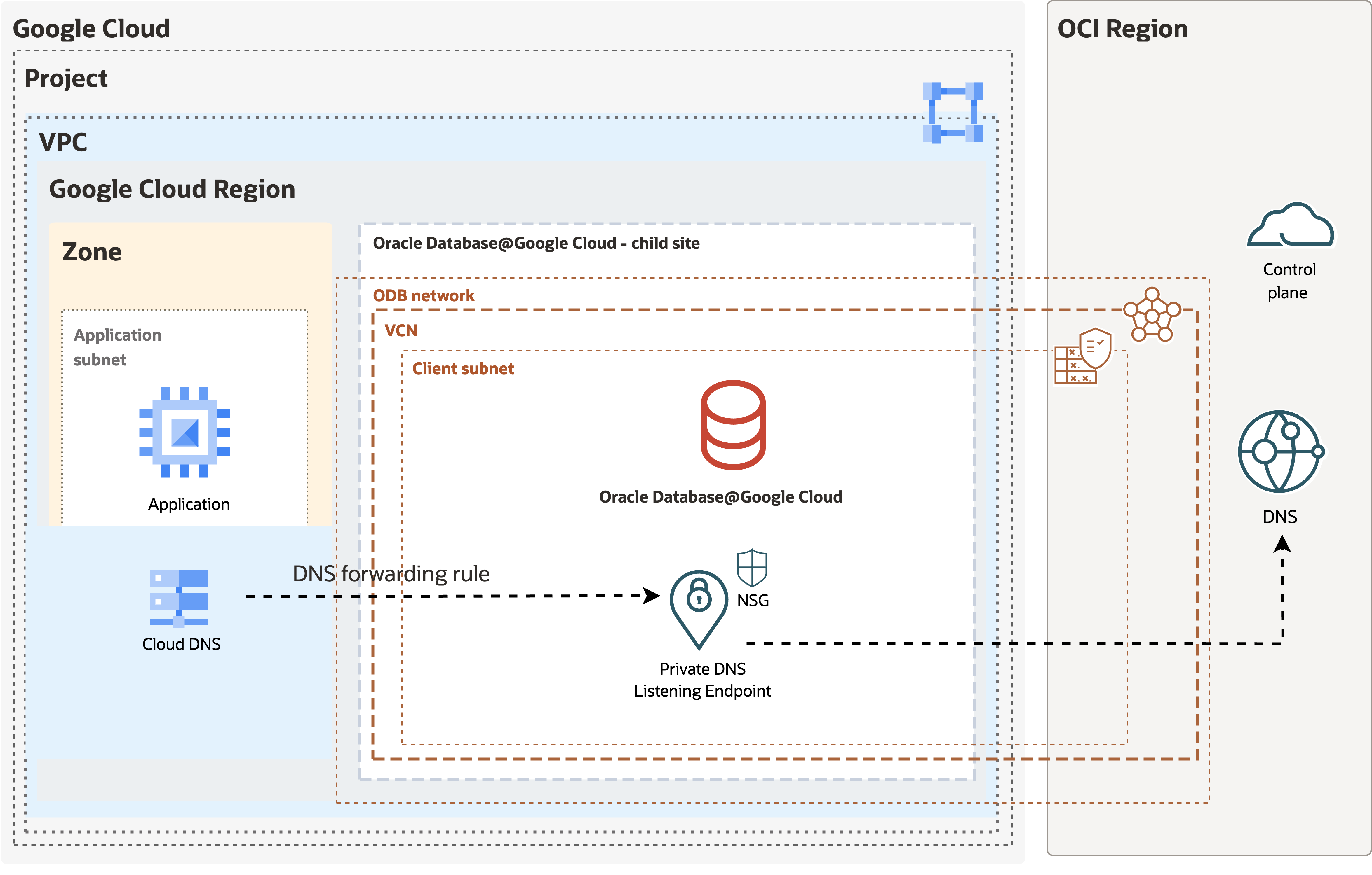 Para admitir la resolución de nombres de dominio, Oracle Database@Google Cloud utiliza el reenvío de DNS en la nube, lo que permite a las cargas de trabajo de Google Cloud resolver nombres de dominio totalmente cualificados (FQDN) de bases de datos alojadas en subredes privadas de OCI.