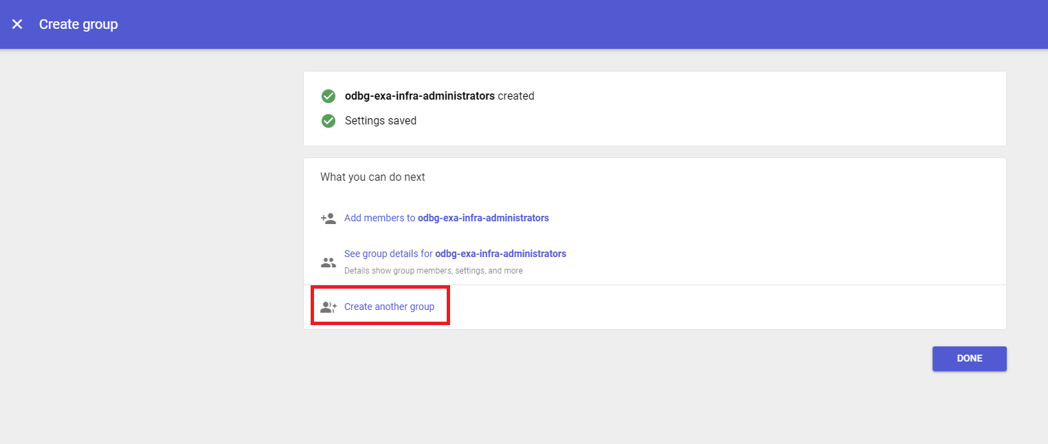 | odbg-exa-infra-readers | odbg-exa-infra-readers@<email_domain> | Visor de infraestructura de Exadata en la nube de Oracle AI Database@Google | Este grupo es para espectadores que necesitan ver todos los recursos de Oracle Exadata Database Service en Google Cloud |