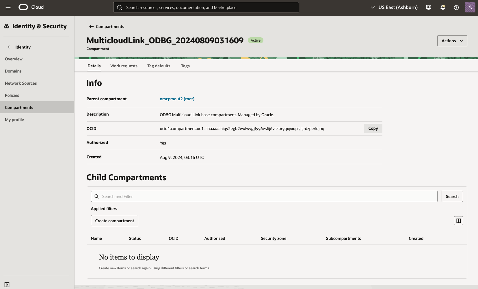 Para confirmar la asignación de suscripciones, los límites y la creación del compartimento de enlaces multinube, complete los pasos de las siguientes secciones: