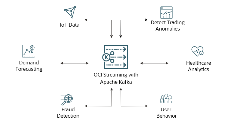 - Utiliza OCI Streaming con Apache Kafka para procesar y analizar flujos continuos de datos de dispositivos IOT u otras aplicaciones ascendentes para obtener información en tiempo real, detección de anomalías y análisis predictivos. Por ejemplo, las instituciones financieras utilizan el servicio para procesar fuentes de datos de mercado, detectar anomalías comerciales y tomar decisiones comerciales en tiempo real. Los minoristas analizan el comportamiento y las preferencias de los clientes en tiempo real para ofrecer recomendaciones y promociones personalizadas.