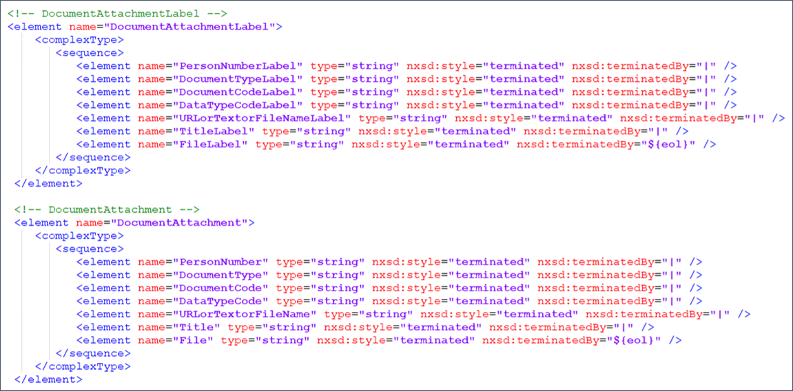 - Suprima los elementos de los grupos DocumentAttachmentLabel y DocumentAttachment para todos los atributos, excepto estos: