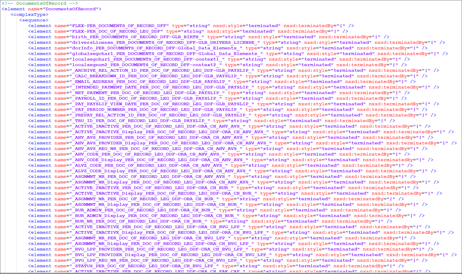 El orden de los elementos de estos grupos determina el orden en que los atributos se incluyen en el archivo generado por OIC. Por ejemplo, esta estructura generará esta línea METADATA:METADATA|DocumentsOfRecord|PersonNumber|DocumentType|DocumentCode|DocumentName