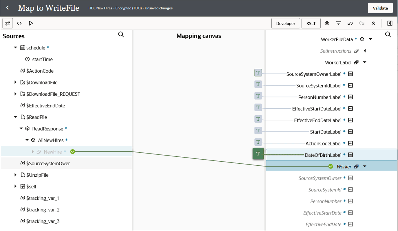 En esta tarea, completará la asignación para transformar los datos de origen en la unidad de archivo del objeto de negocio. Worker.dat, en este ejemplo.