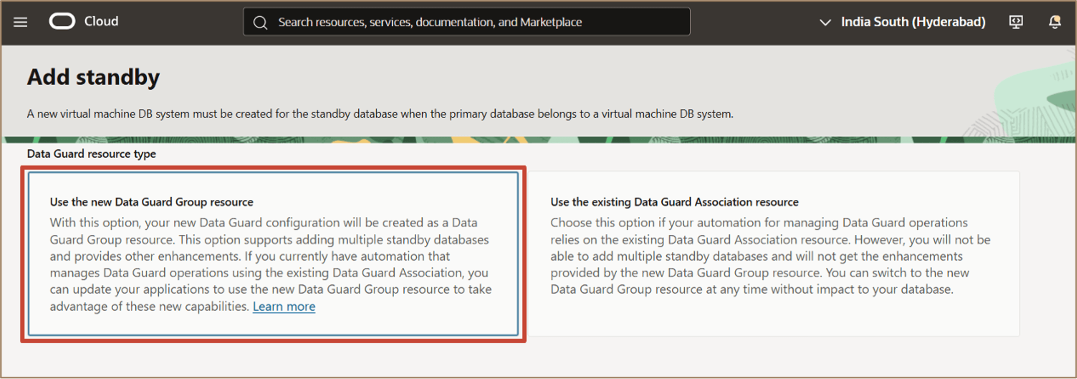 En el flujo de trabajo Agregar base de datos en espera, seleccione Usar el nuevo recurso de grupo de Data Guard.