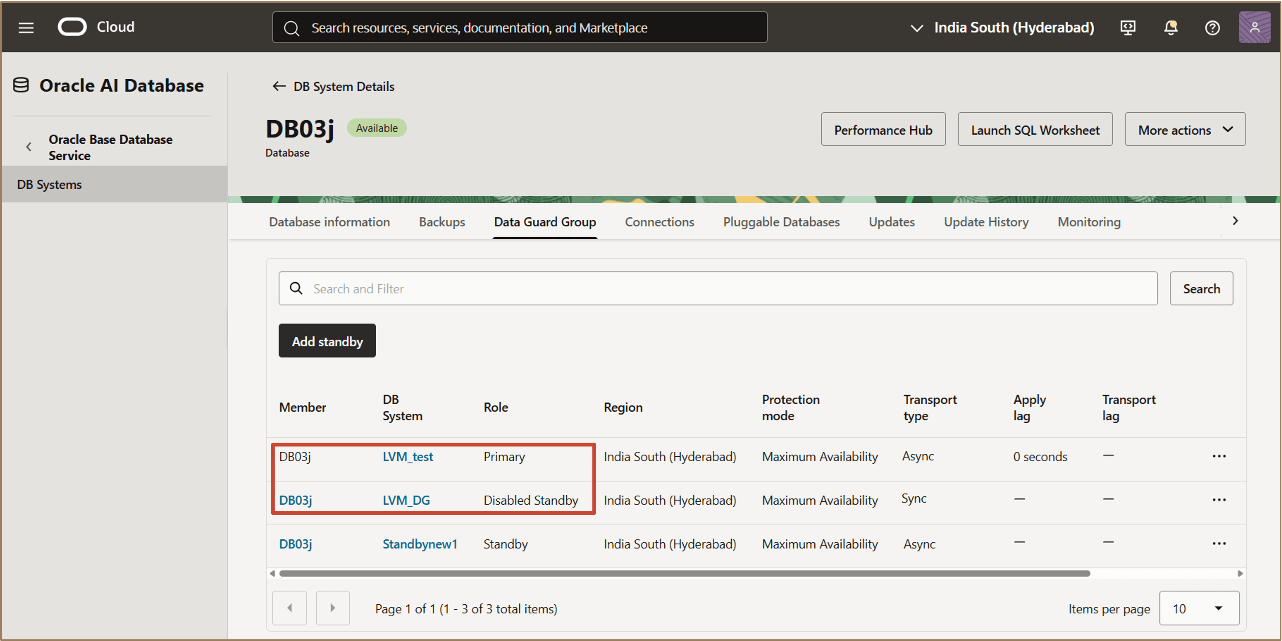 Verifique que las bases de datos principal y en espera se muestran en el grupo de Data Guard.