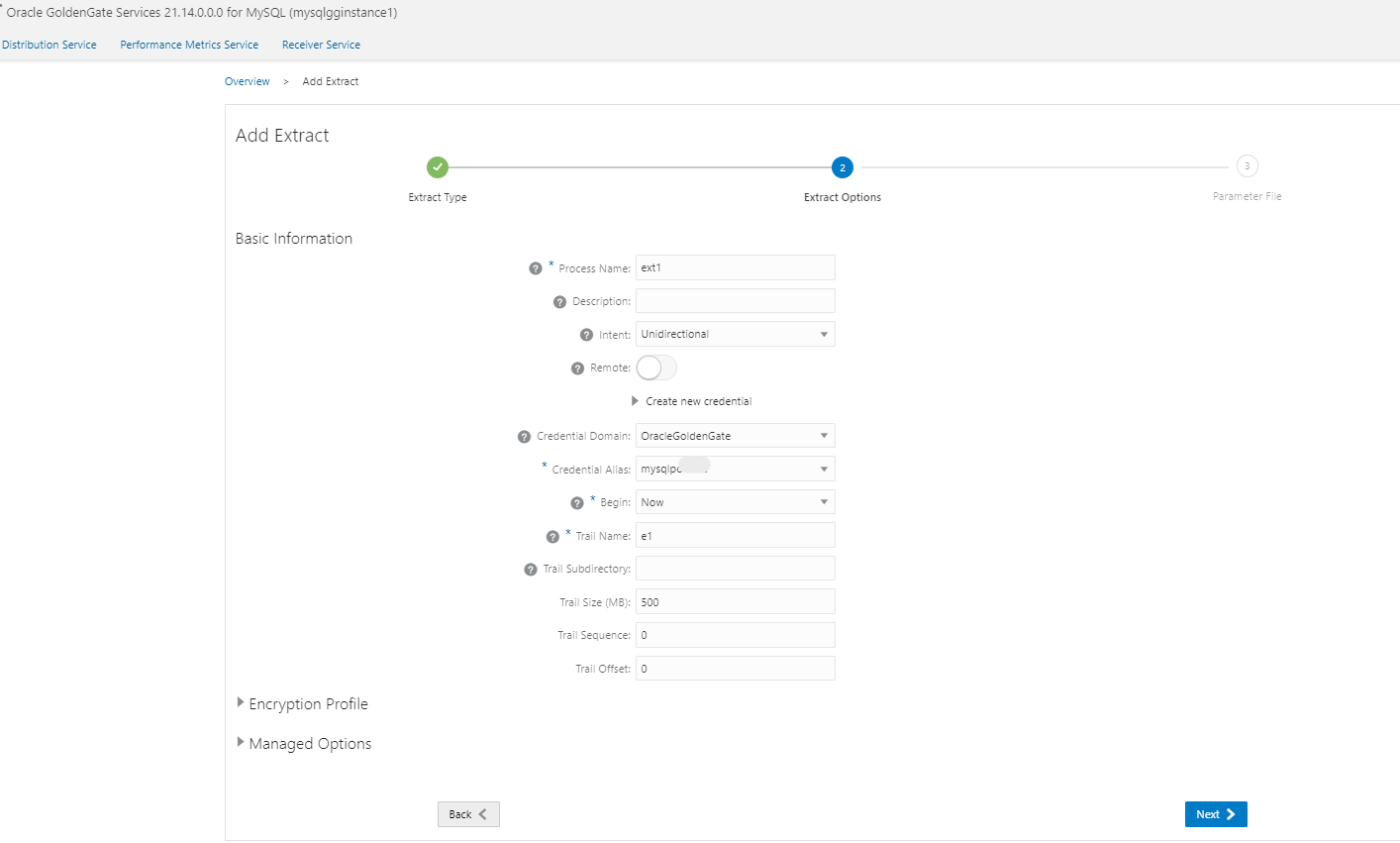 MySQL> select @@gtid_executed, @@gtid_purged\G *************************** 1. row *************************** @@gtid_executed: 3b631a96-6aa7-11ef-95c0-02001701769c:1-94 <--- make a note of this GTID @@gtid_purged: 3b631a96-6aa7-11ef-95c0-02001701769c:1-72 1 row in set (0.00 sec) MySQL>Inicie Extract y manténgalo en ejecución todo el tiempo, incluso cuando aún esté trabajando en la configuración de la base de datos de destino para asegurarse de que se capturan todos los cambios.