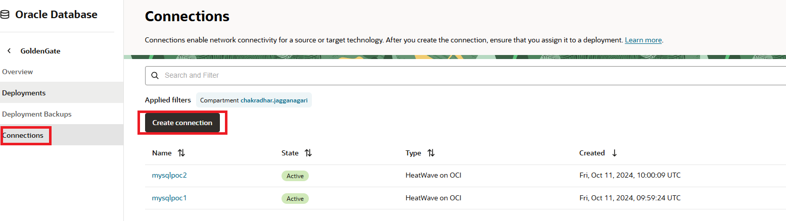 Vaya a la página de despliegue GoldenGate de OCI y haga clic en Conexiones para configurar la conexión.