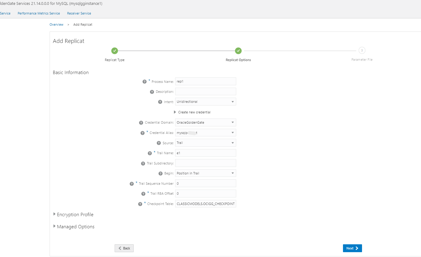 Cree un Replicat principal para el destino (todavía no inicie el proceso).