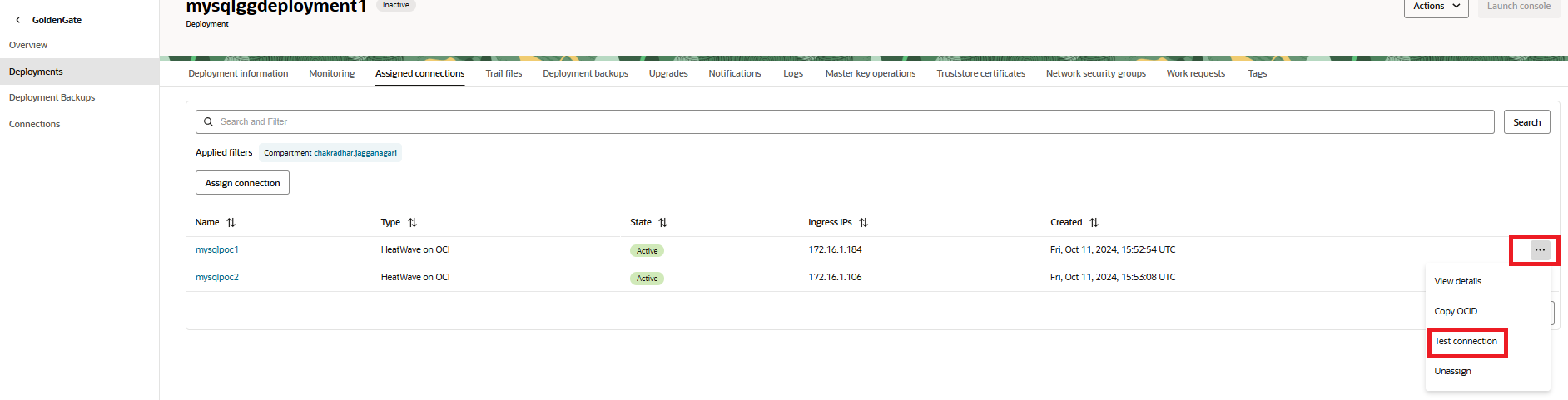Valide las mismas conexiones desde la consola de OCI GoldenGate.