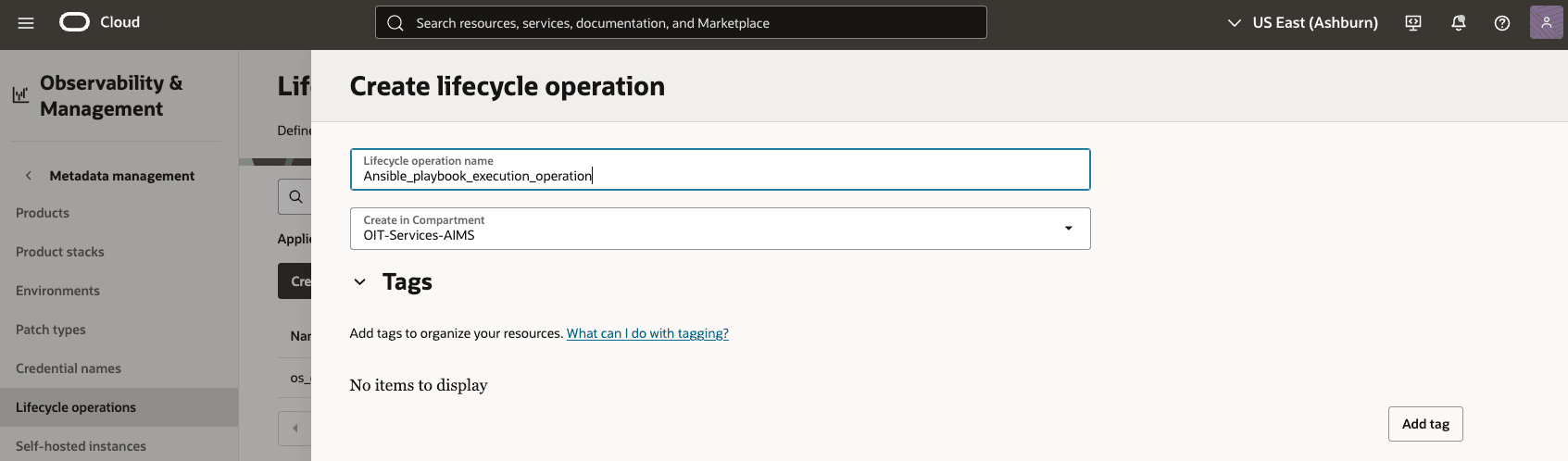 - Cree un nuevo trabajo o ejecución, seleccionando ansible_playbook_runbook y la operación de ciclo de vida.
