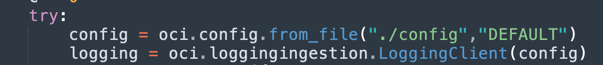 Esta parte del código utiliza el SDK de OCI para Python para cargar el archivo de configuración y la clave privada para acceder a su arrendamiento de OCI.