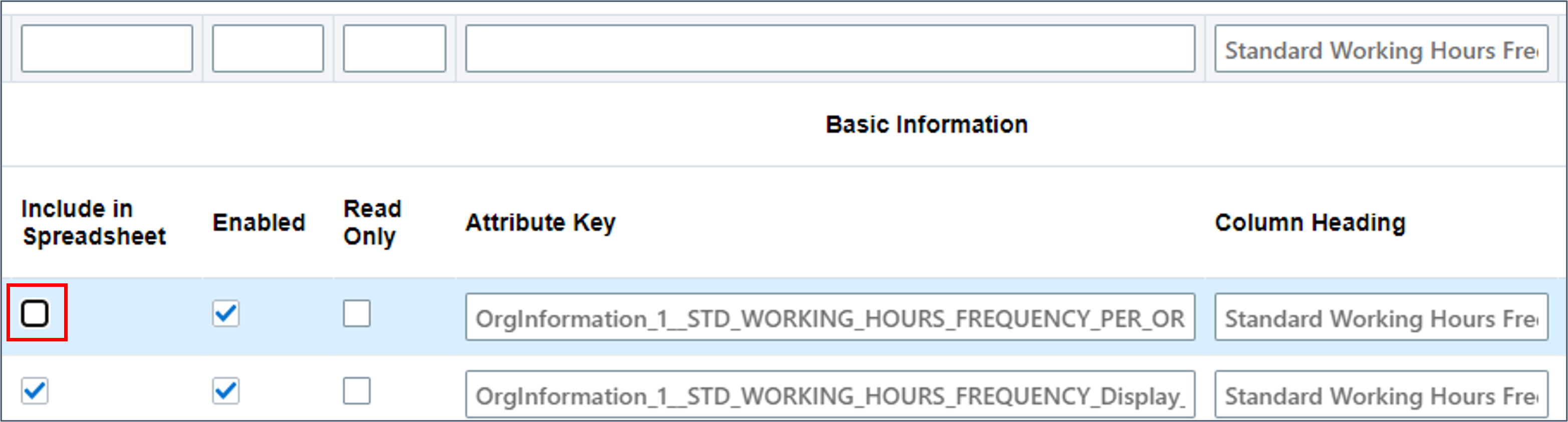 - Décochez la case Inclure dans la feuille de calcul pour chaque attribut de segment de champ flexible spécifique au nouveau contexte de champ flexible extensible de l'enregistrement d'informations supplémentaires sur l'organisation initial.