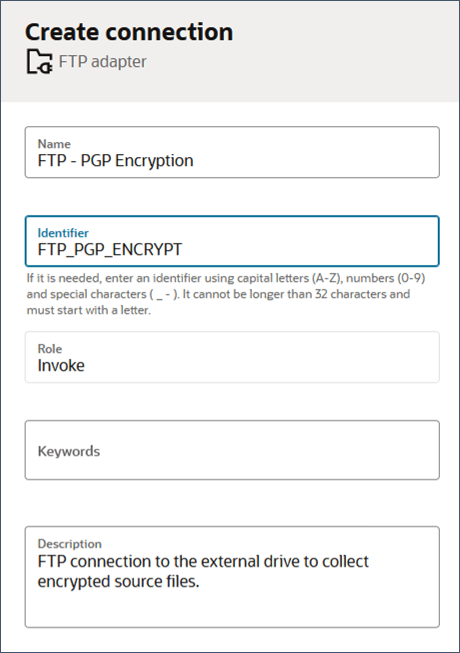 Dans cette tâche, vous allez définir une connexion FTP dans OIC qui peut être utilisée pour lire et déchiffrer les fichiers sources à partir d'un serveur FTP externe.