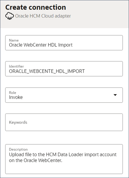 Cette connexion peut être utilisée par toutes vos intégrations HDL pour charger des fichiers HDL sur le serveur Oracle WebCenter Content, prêts à être traités par HDL.