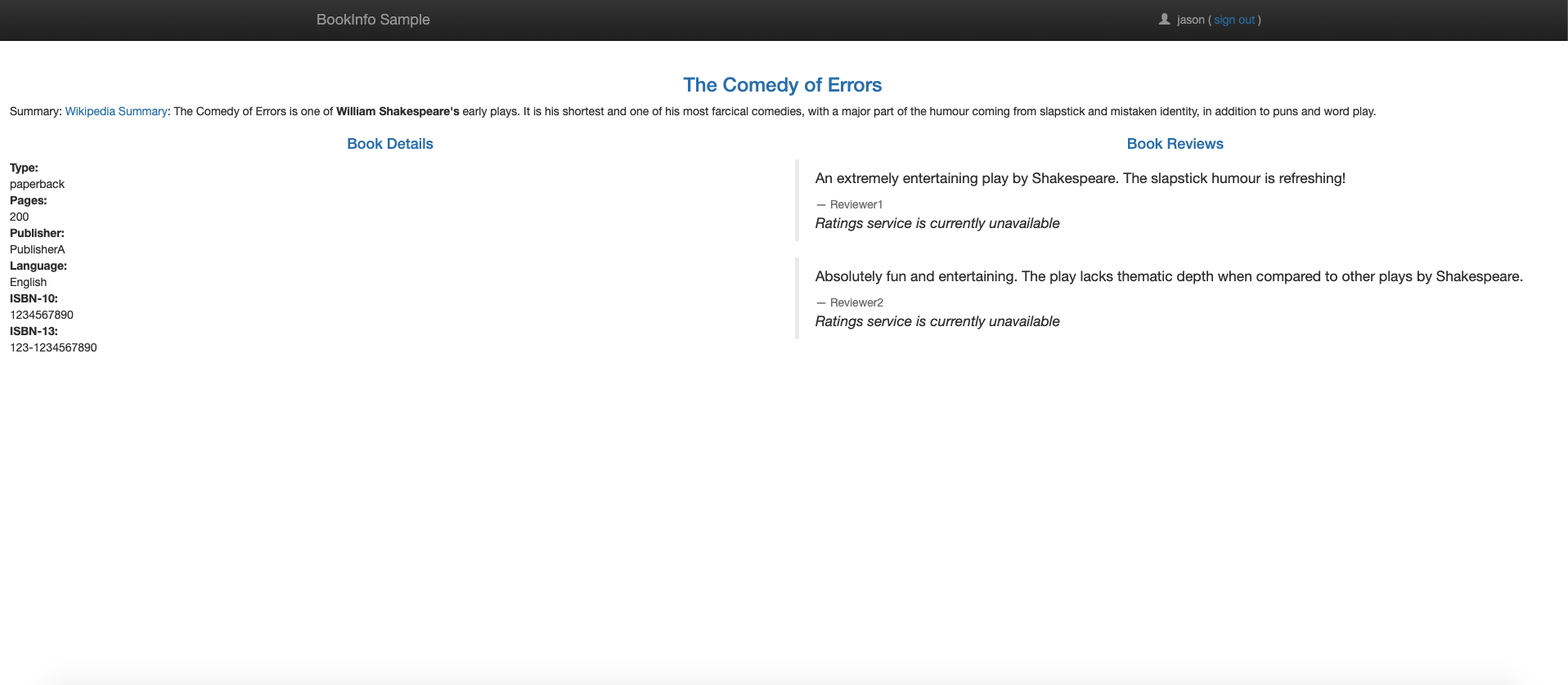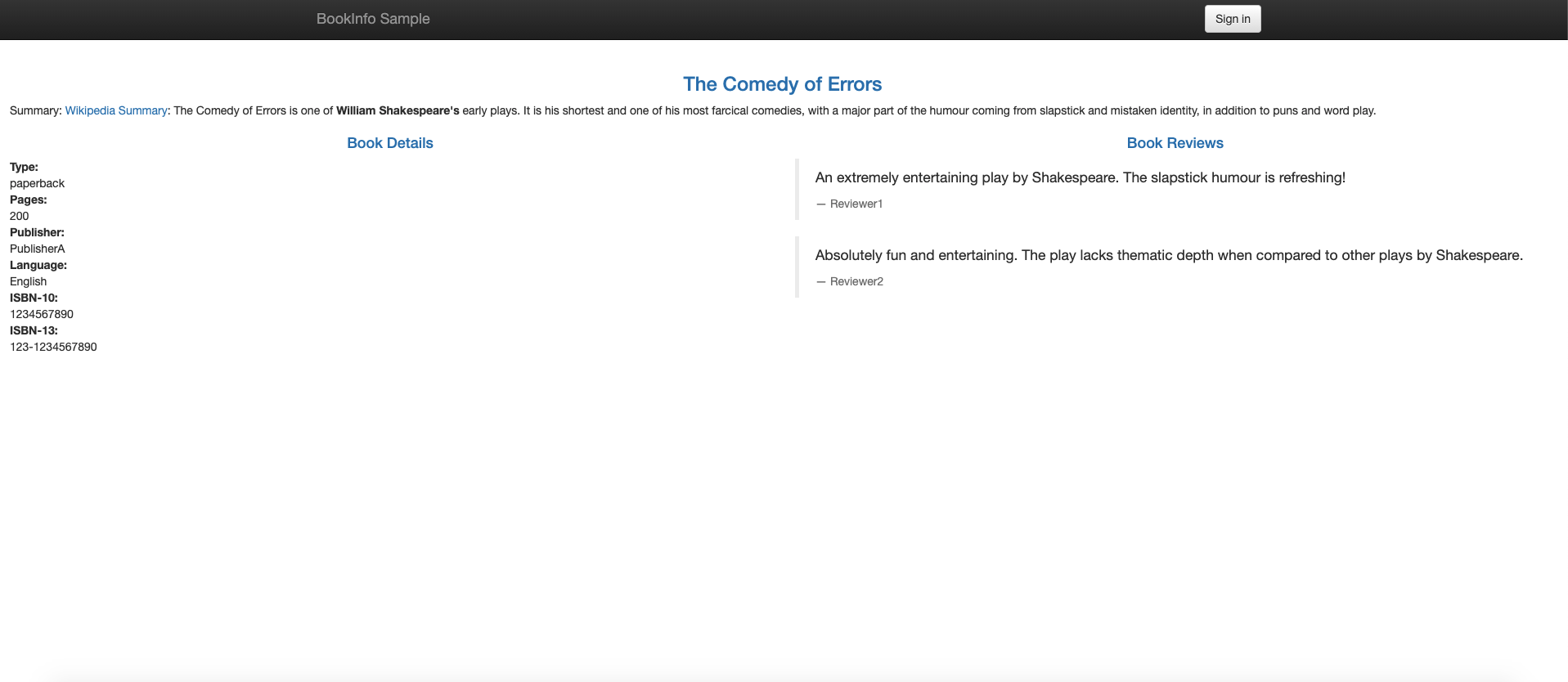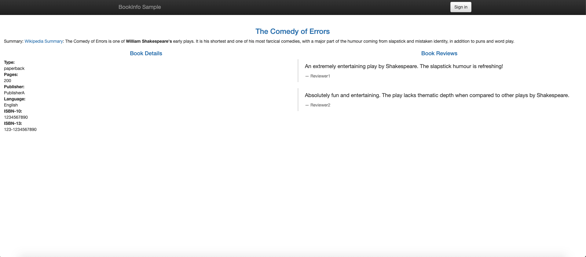 Le projet Istio fournit l'application Bookinfo comme un moyen de démontrer les fonctionnalités d'Istio. L'application affiche des informations sur un livre, similaires à une entrée de catalogue unique d'un magasin de livres en ligne. Chaque page de livre contient une description du livre, des détails sur le livre (ISBN, nombre de pages), et quelques critiques de livre. Pour plus d'informations sur l'application Bookinfo, consultez les documents Bookinfo ici.