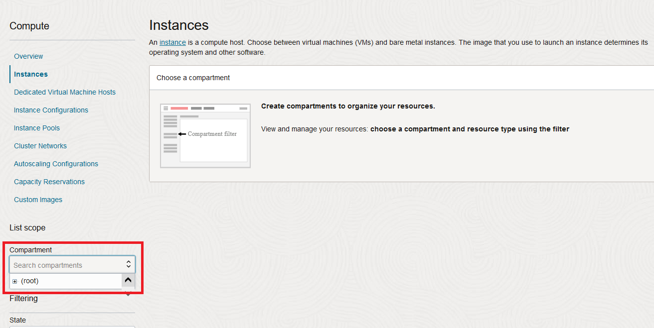- Dans la console, les compartiments se comportent comme des filtres pour l'affichage des ressources. Lorsque vous sélectionnez un compartiment, vous ne voyez que les ressources de celui-ci. Pour voir les ressources d'un autre compartiment, vous devez d'abord sélectionner ce compartiment. Vous pouvez utiliser la fonction de recherche pour obtenir la liste des ressources situées dans plusieurs compartiments. Voir Aperçu de la fonction de recherche.
