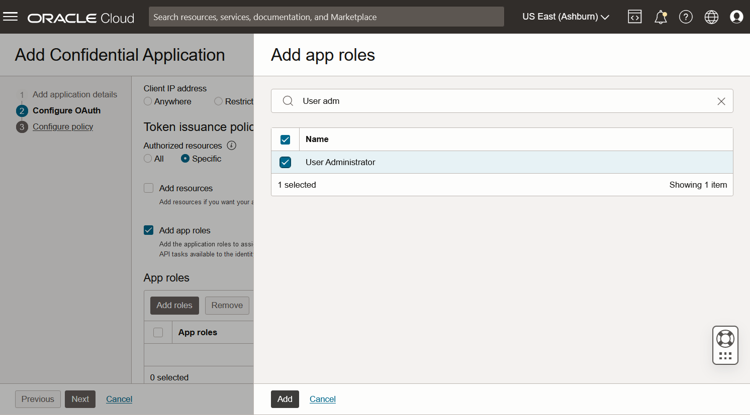 Dans la page Configurer OAuth, faites défiler l'affichage vers le bas et recherchez la section Politique d'émission de jetons. Sous Ressources autorisées, sélectionnez Spécifique, puis cochez Ajouter des rôles d'application pour ouvrir la section Rôles d'application du flux de travail.