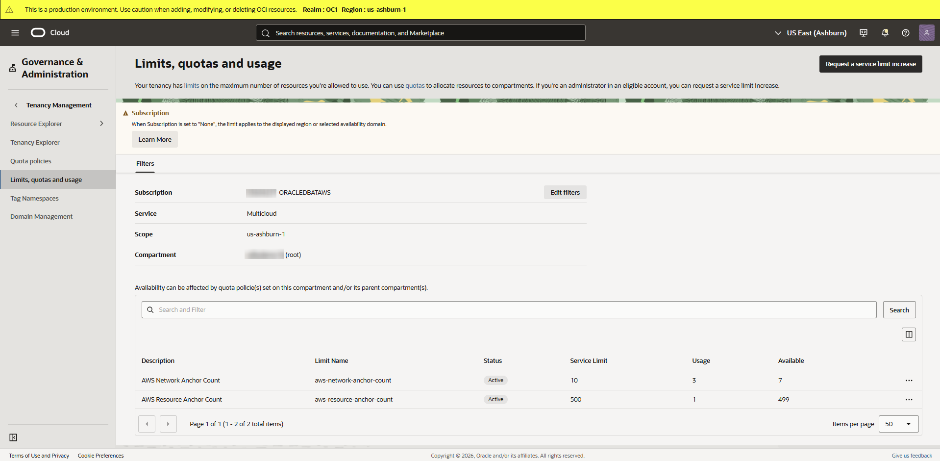 Pour voir vos limites de service Oracle AI Database@AWS dans la console Oracle Cloud (OCI), procédez comme suit :Pour augmenter vos limites de service Oracle AI Database@AWS dans la console Oracle Cloud (OCI), voir Demande d'une augmentation de limite.