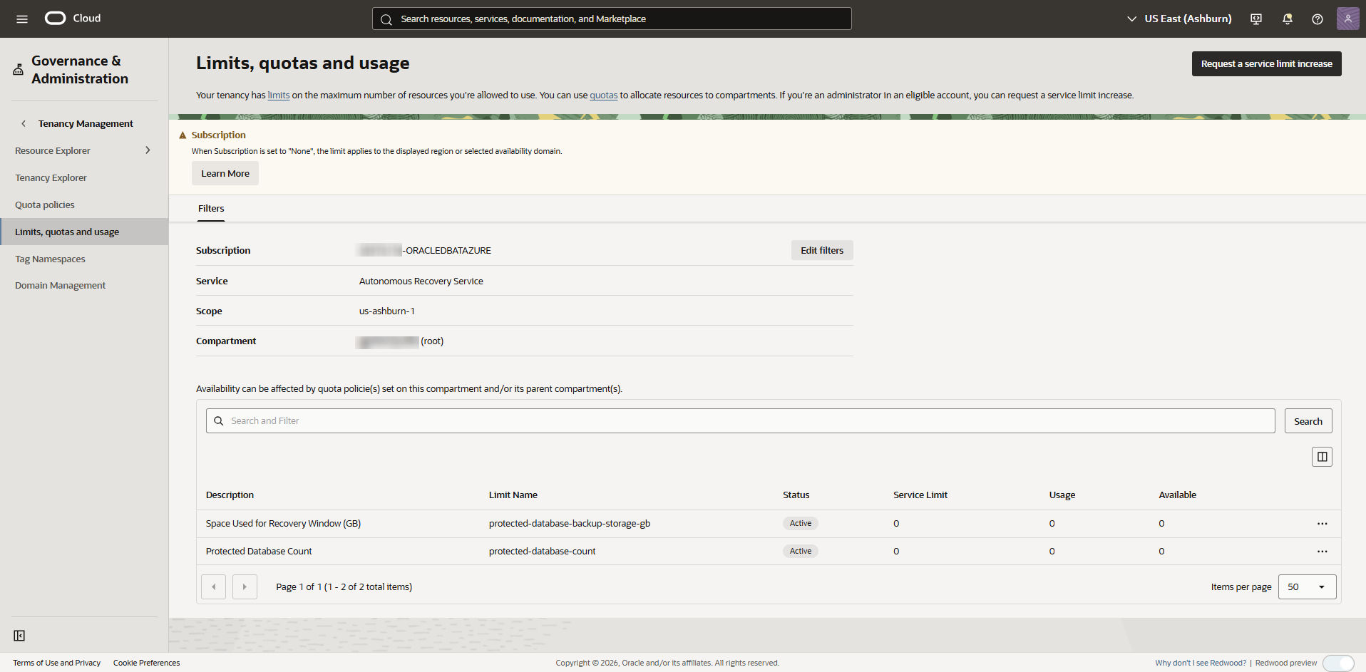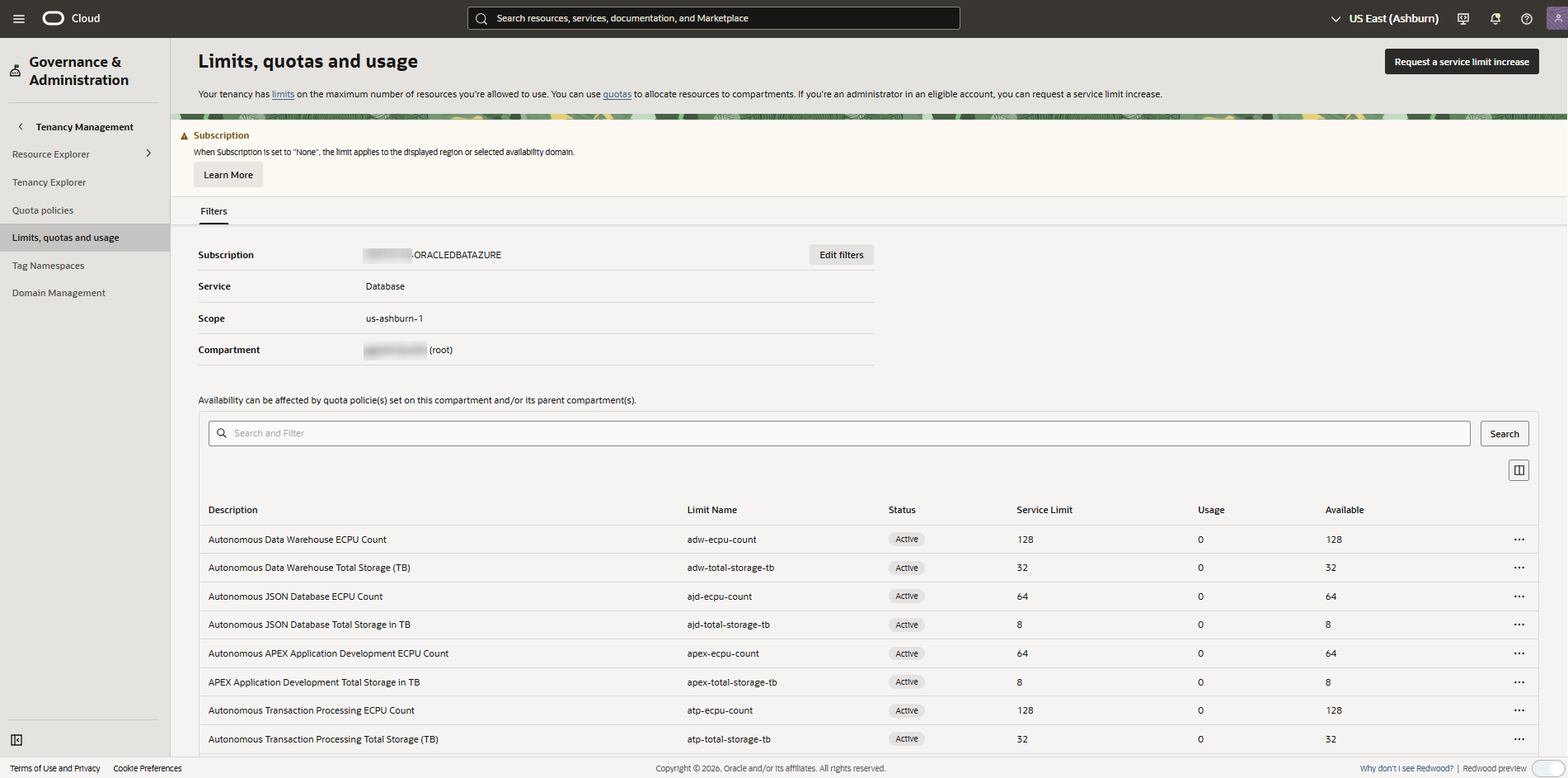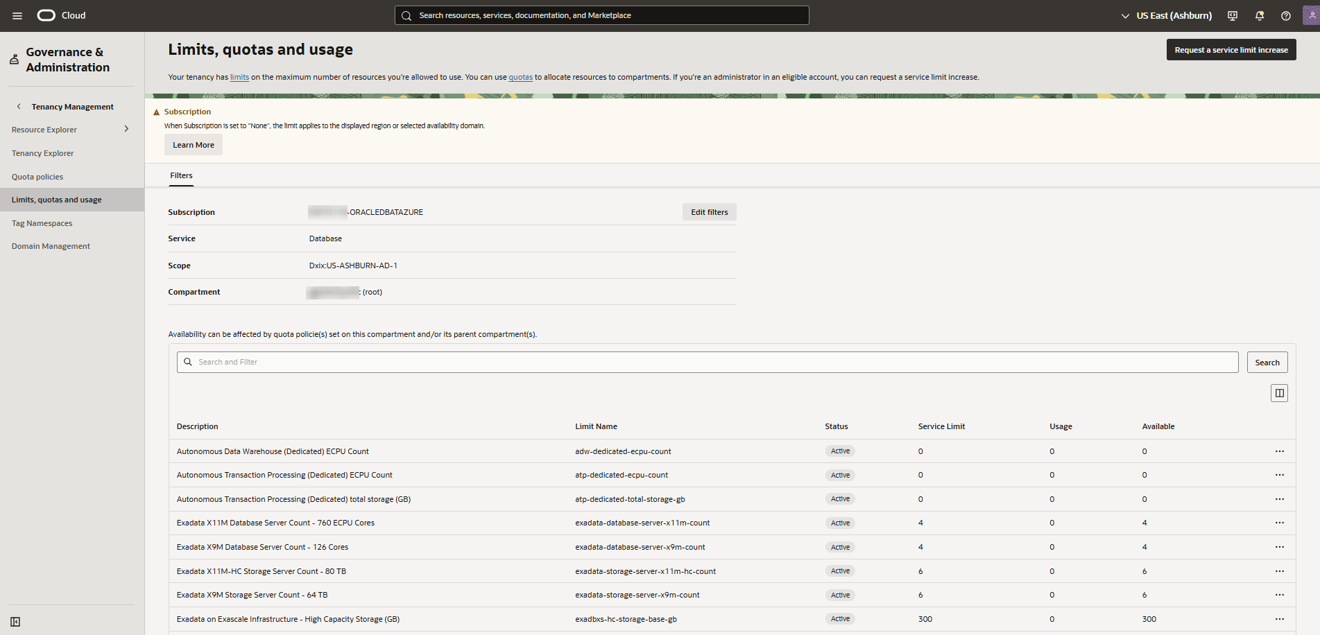 Pour voir vos limites de service Oracle AI Database@Azure dans la console Oracle Cloud (OCI), procédez comme suit :Pour augmenter vos limites de service Oracle AI Database@Azure dans la console Oracle Cloud (OCI), voir Demande d'une augmentation de limite.