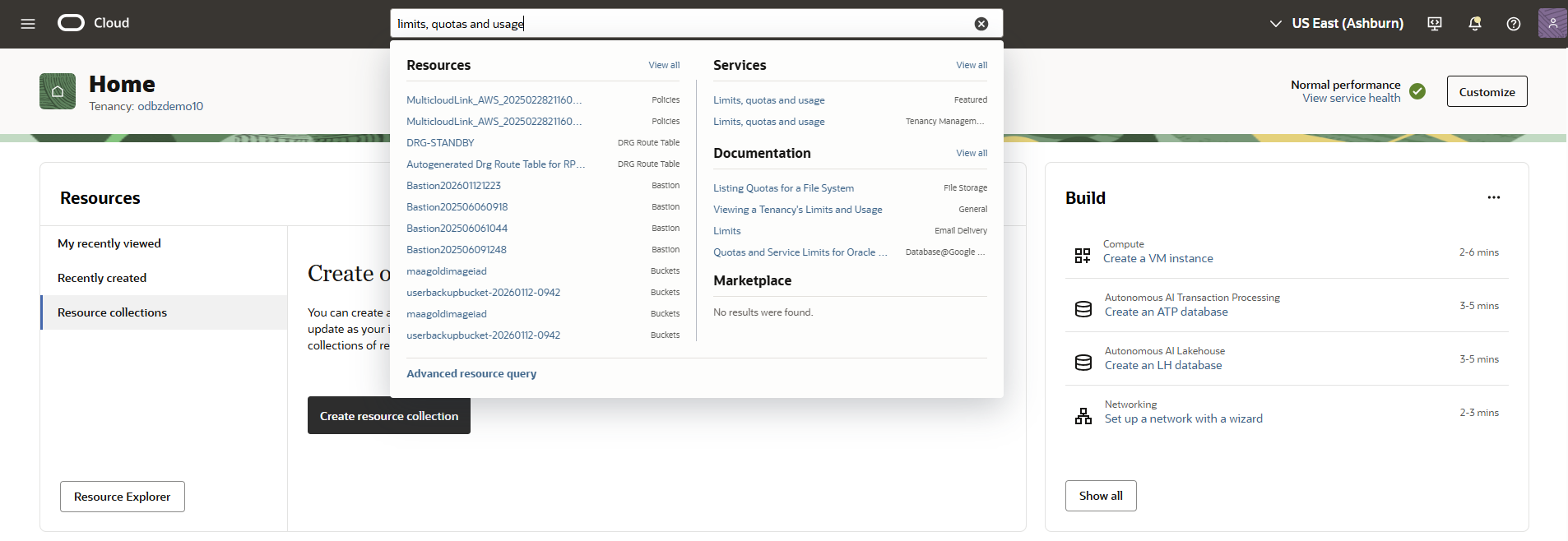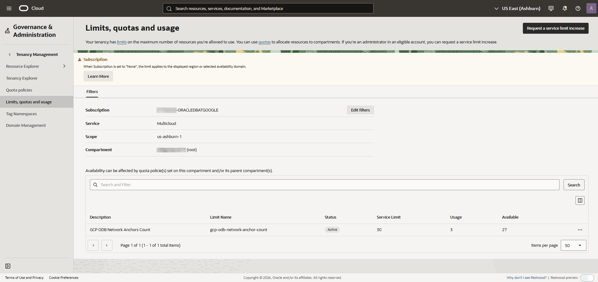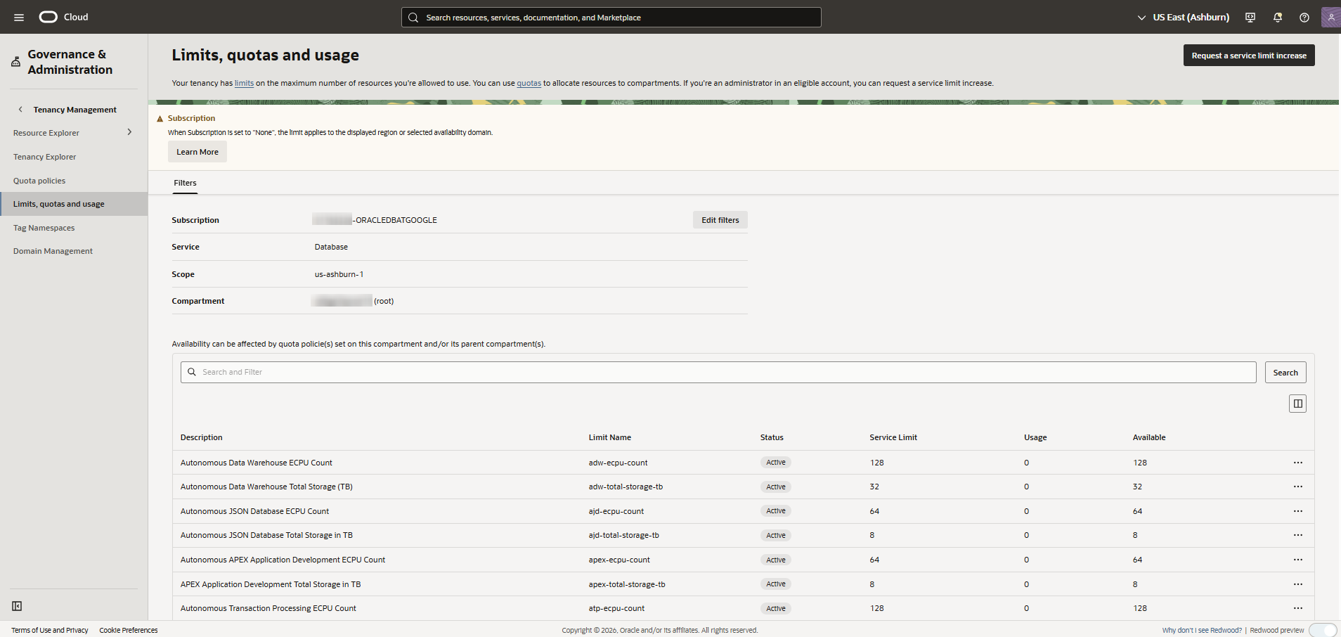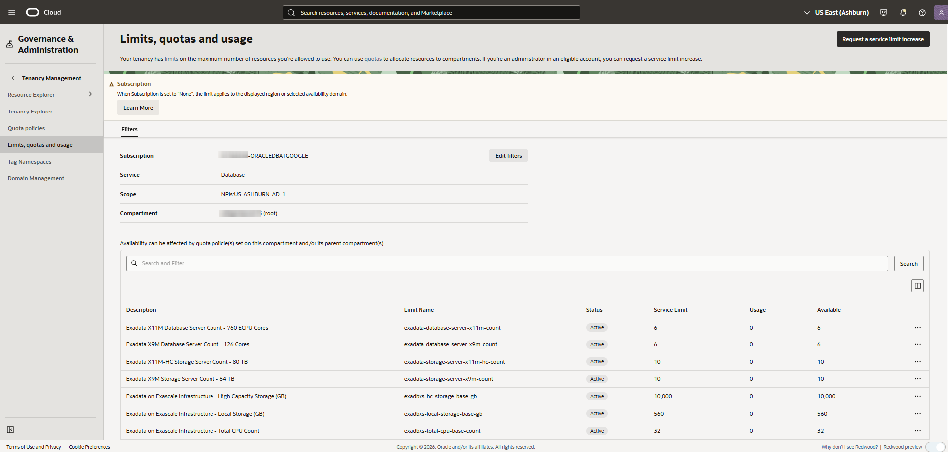 Pour voir vos limites de service Oracle AI Database@Google Cloud dans la console Oracle Cloud Console (OCI), procédez comme suit :Pour augmenter vos limites de service Oracle AI Database@Google Cloud dans la console Oracle Cloud (OCI), voir Demande d'une augmentation de limite.