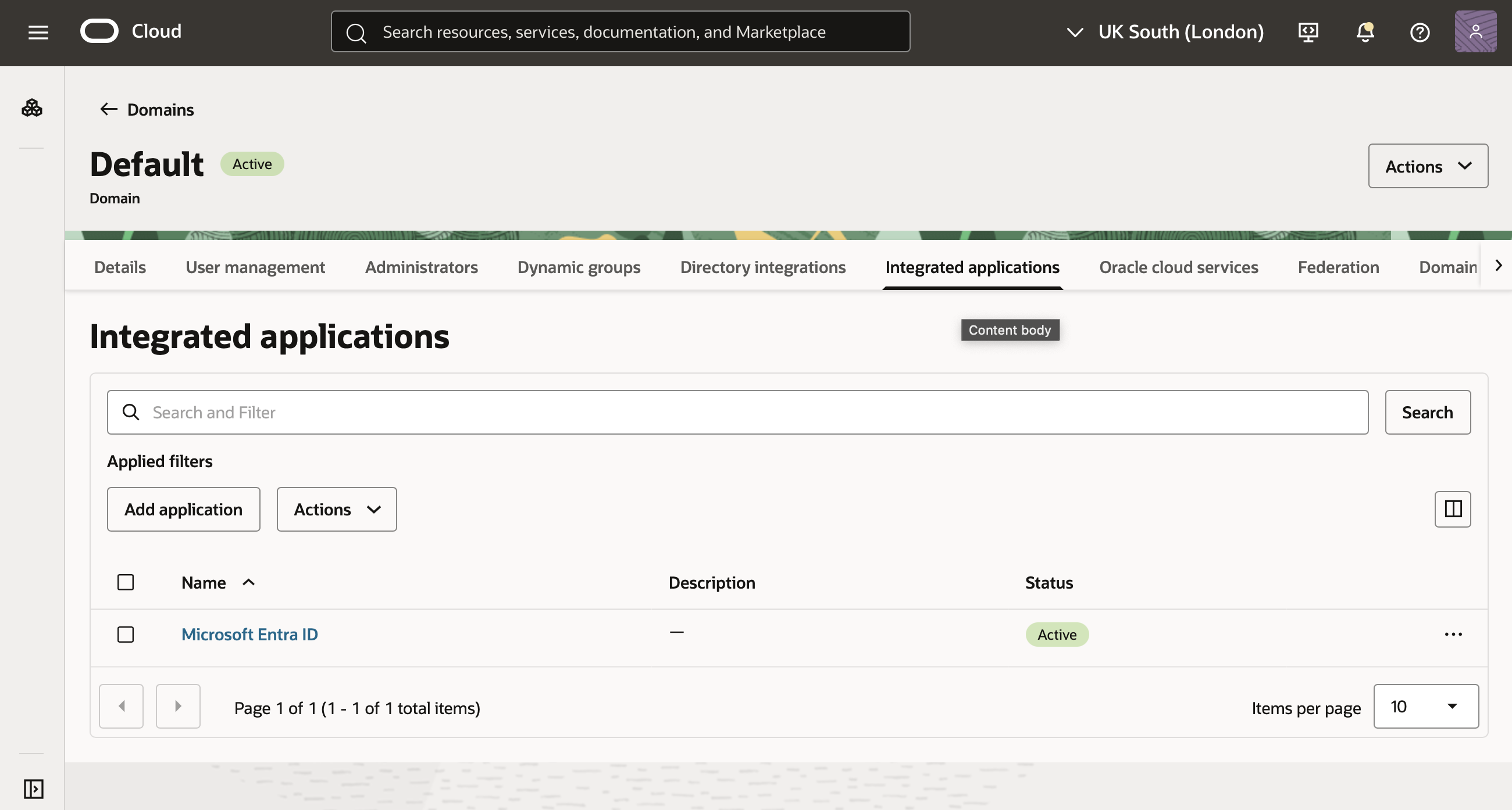 Dans l'onglet Applications intégrées de la page de détails du domaine par défaut, sélectionnez le nom de l'application Entra ID que vous avez créée pour ouvrir la page de détails de l'application.