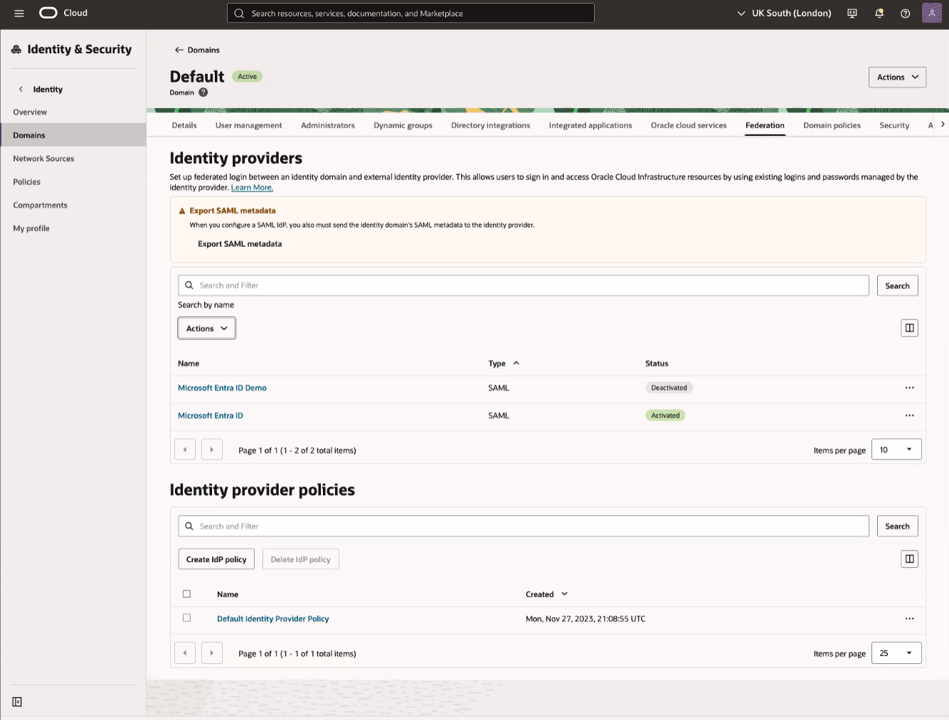 Sélectionnez l'onglet Fédération dans le menu de navigation de la page Détails du domaine d'identité.