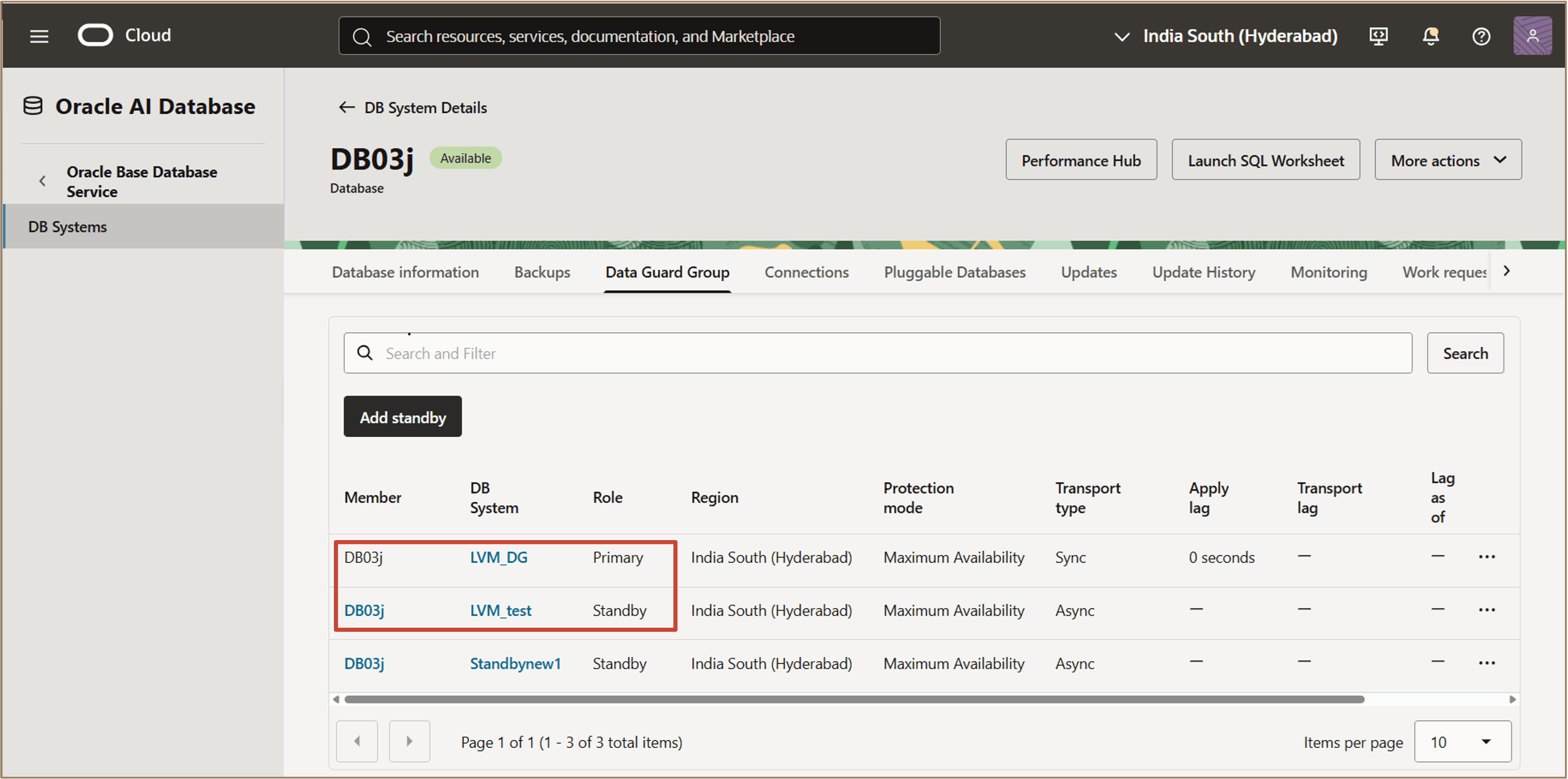 Vérifiez que les bases de données principale et de secours sont répertoriées dans le groupe Data Guard.
