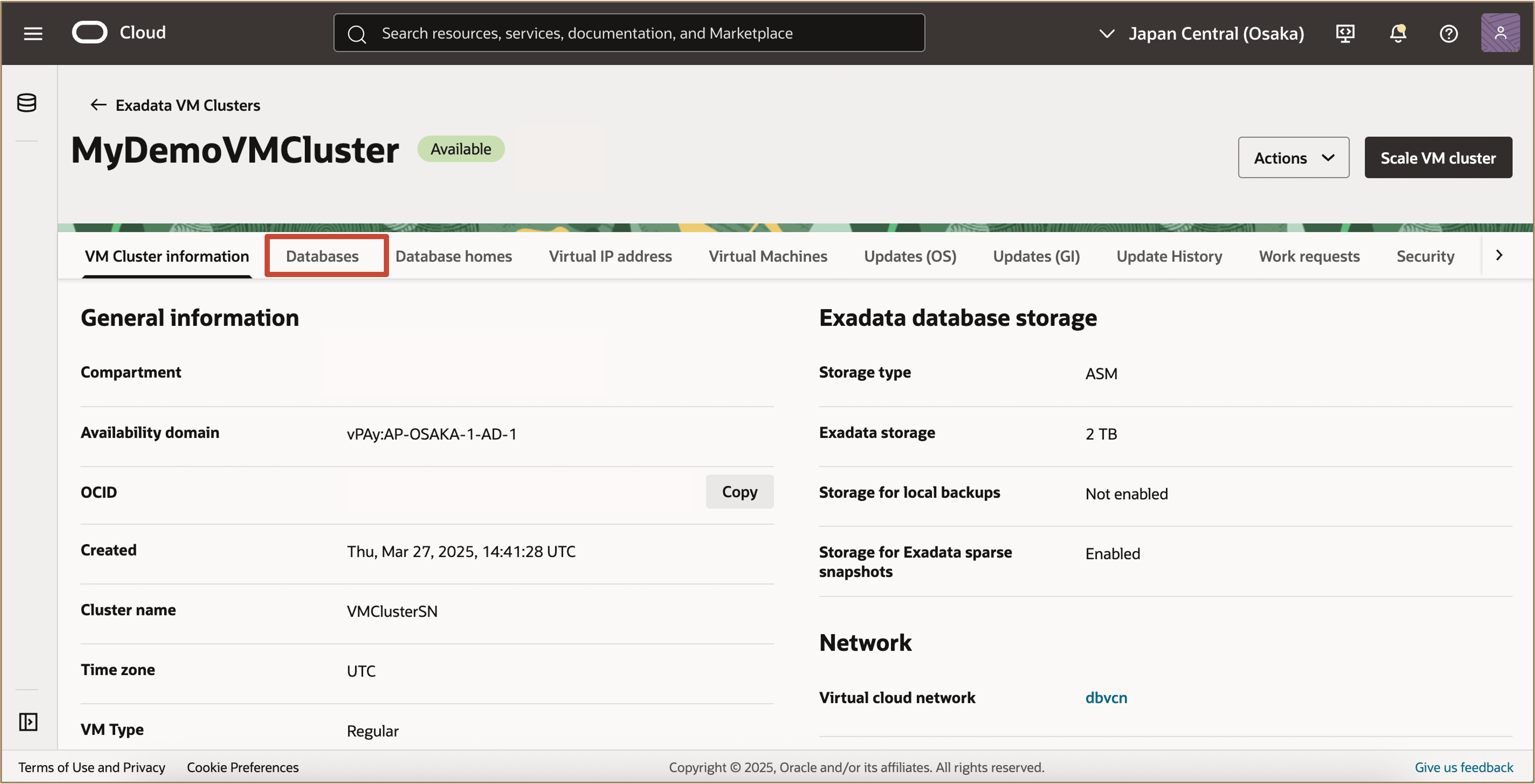 Accédez au cluster de machines virtuelles qui contient la base de données d'un groupe Data Guard existant pour lequel vous voulez visualiser l'état de Data Guard. Cliquez sur l'onglet Bases de données et sélectionnez le nom de la base de données.