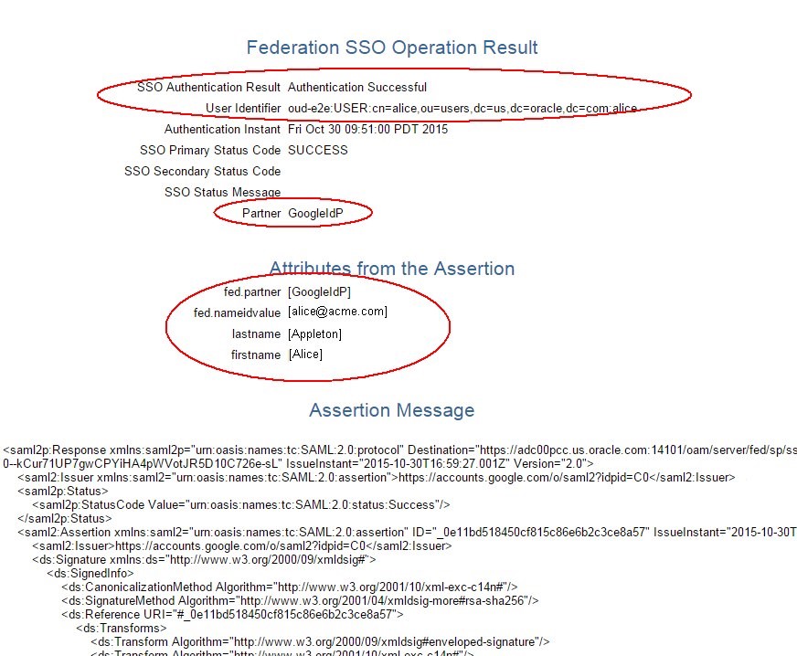 Une fois celui-ci saisi, Google IdP vous authentifie et vous redirige vers le fournisseur de services SAML OAM qui affiche le résultat de l'authentification unique de fédération.