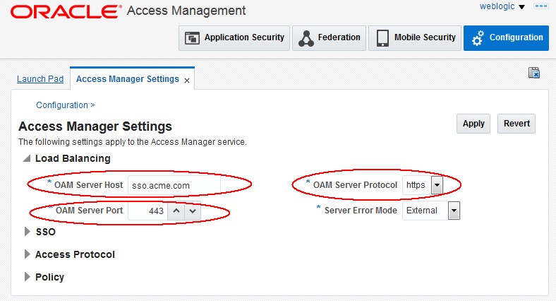 oam-public-hostname est l'hôte du serveur OAM, oam-public-port est le port du serveur OAM et le protocole (http ou https) est répertorié dans le protocole du serveur OAM.