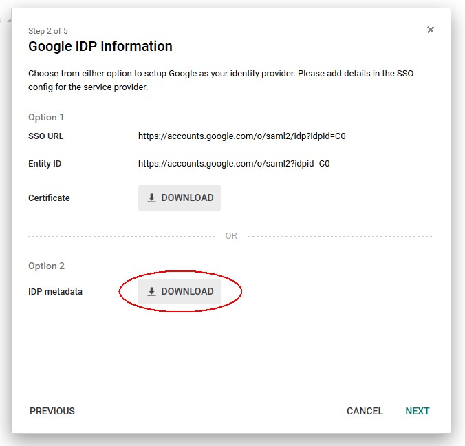 Dans la section Option 2, cliquez sur le bouton Télécharger pour télécharger le fichier de métadonnées Google IdP SAML 2.0 sur votre ordinateur local.