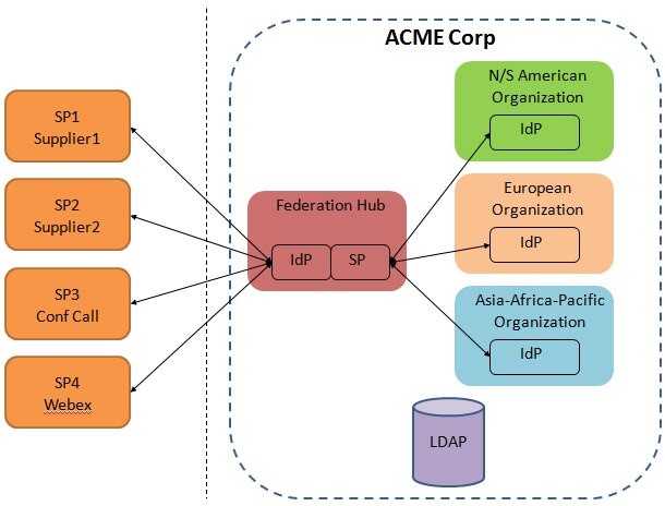 L'instance Federation Hub sert de fournisseur de services à l'adresse IdPs interne d'ACME Corp.