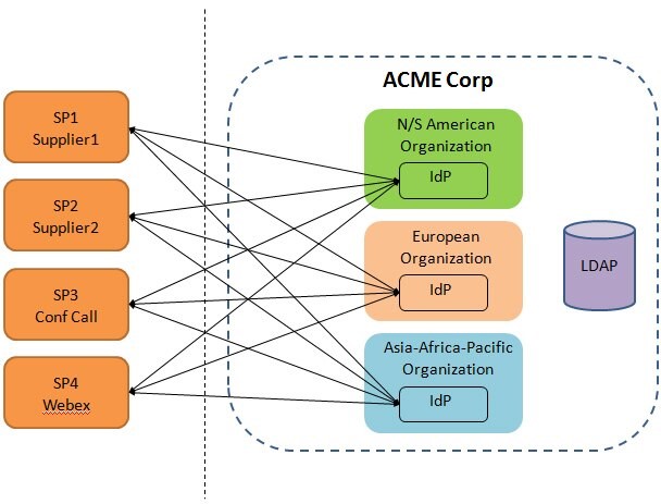 Les protocoles SSO et SAML de fédération ont été définis pour permettre à deux domaines de sécurité distincts d'effectuer un SSO interdomaine d'une manière qu'un partenaire n'aurait pas besoin de connaître sur l'implémentation et le déploiement de la sécurité de l'autre partenaire. Dans ce cas, il devient évident que cette promesse est rompue et que la complexité des choix de sécurité d'ACME Corp a un impact sur les partenaires SP.
