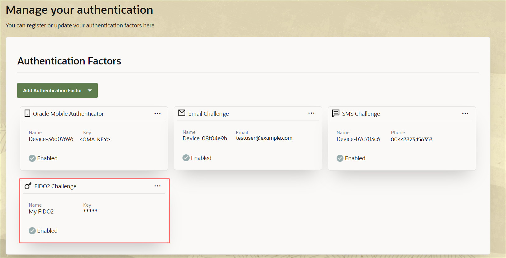 3. Sélectionnez Ajouter un facteur d'authentification et, dans le menu déroulant, sélectionnez FIDO2 Challenge.