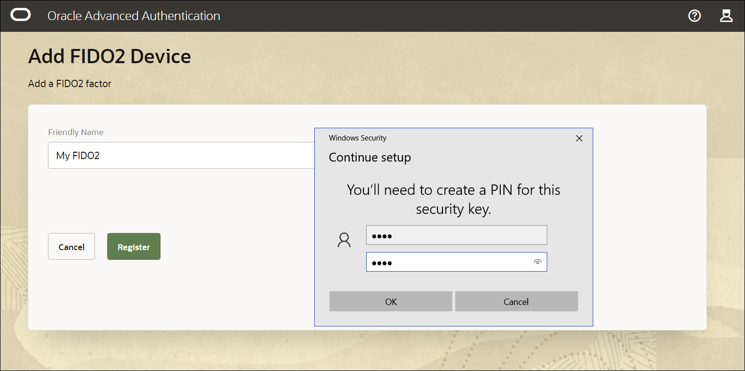 7. Si vous n'avez pas encore configuré de code PIN pour votre appareil FIDO2, vous serez invité à en créer un. Entrez un code PIN, puis cliquez sur OK.