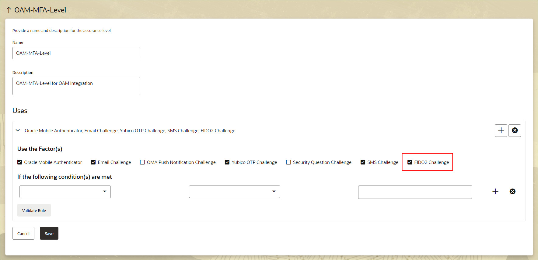 4. Dans l'onglet Niveaux d'assurance, cliquez sur le niveau d'assurance. Par exemple, OAM MFA-Level.