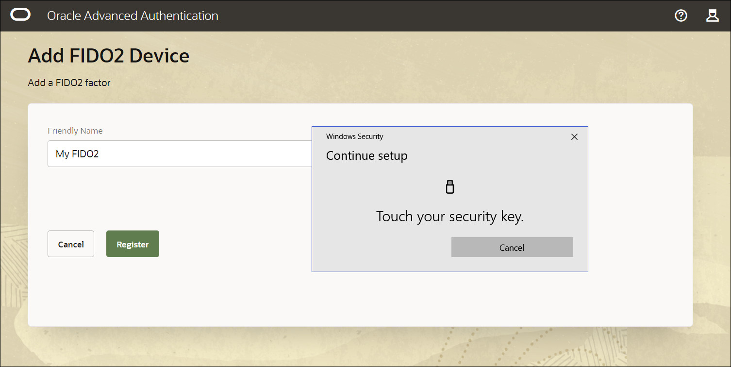 Configuration de FIDO2 avec l'authentification avancée Oracle